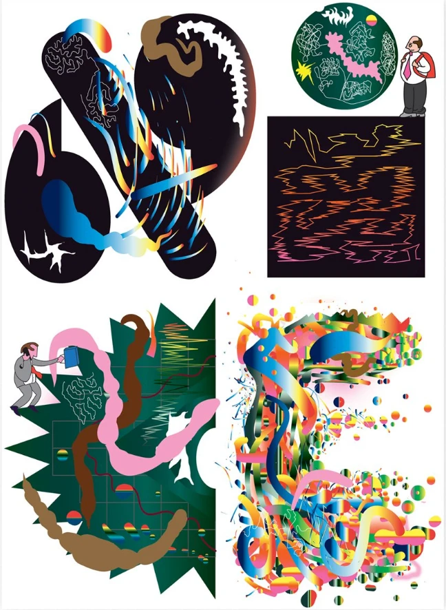 His work is simultaneously abrasive and fun while always seem to be dripping in primary colors. He works well in the realm of Bloomberg's abstract and playful compositions that put a pin in a new concepts. He's now a part of their design department or filling in time with other freelance projects. Though his work is so unique, it does not have the same strangeness or obscurity of David Carson, it strives for it's design purpose through insanity.