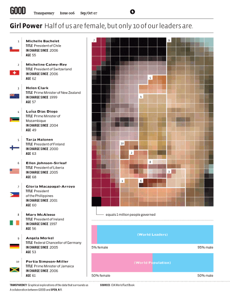 Information design can be excellent or very sterile. It can quickly take information and put an image that resembles the topic but fails to tell a story. Exceptional information design utilizes a visual that is relatable, and quickly educates us as to what the “story” is behind the information design being represented. For this example, the designer took the information, and made a visual that clearly showcased the reality of women in power. Using the idea of a face being broken up into different races and demographics, shows how each female leader’s power is in comparison to the others. It also paints a picture of ethnicity as we see side-by-side the different races that are represented across the globe.