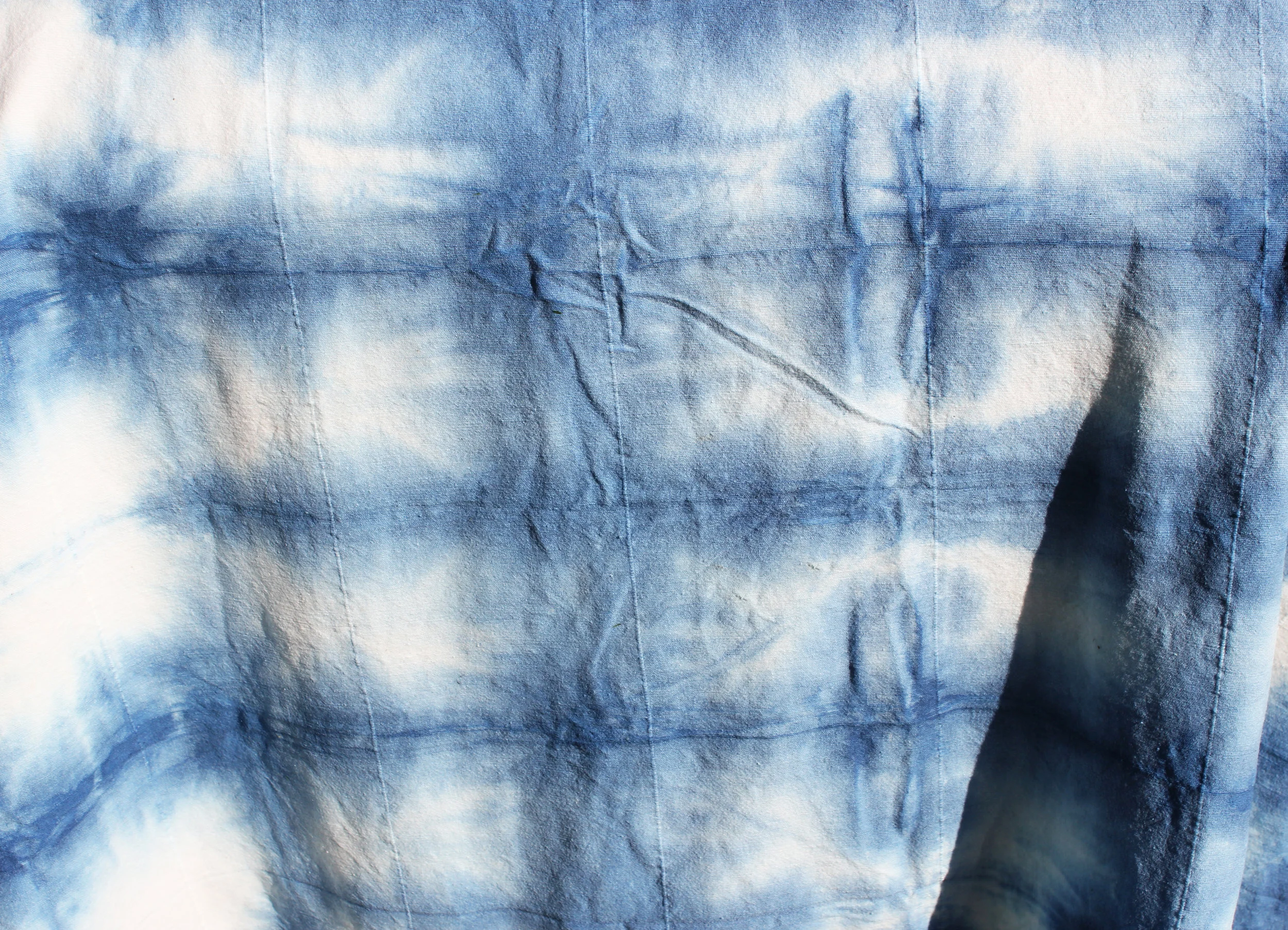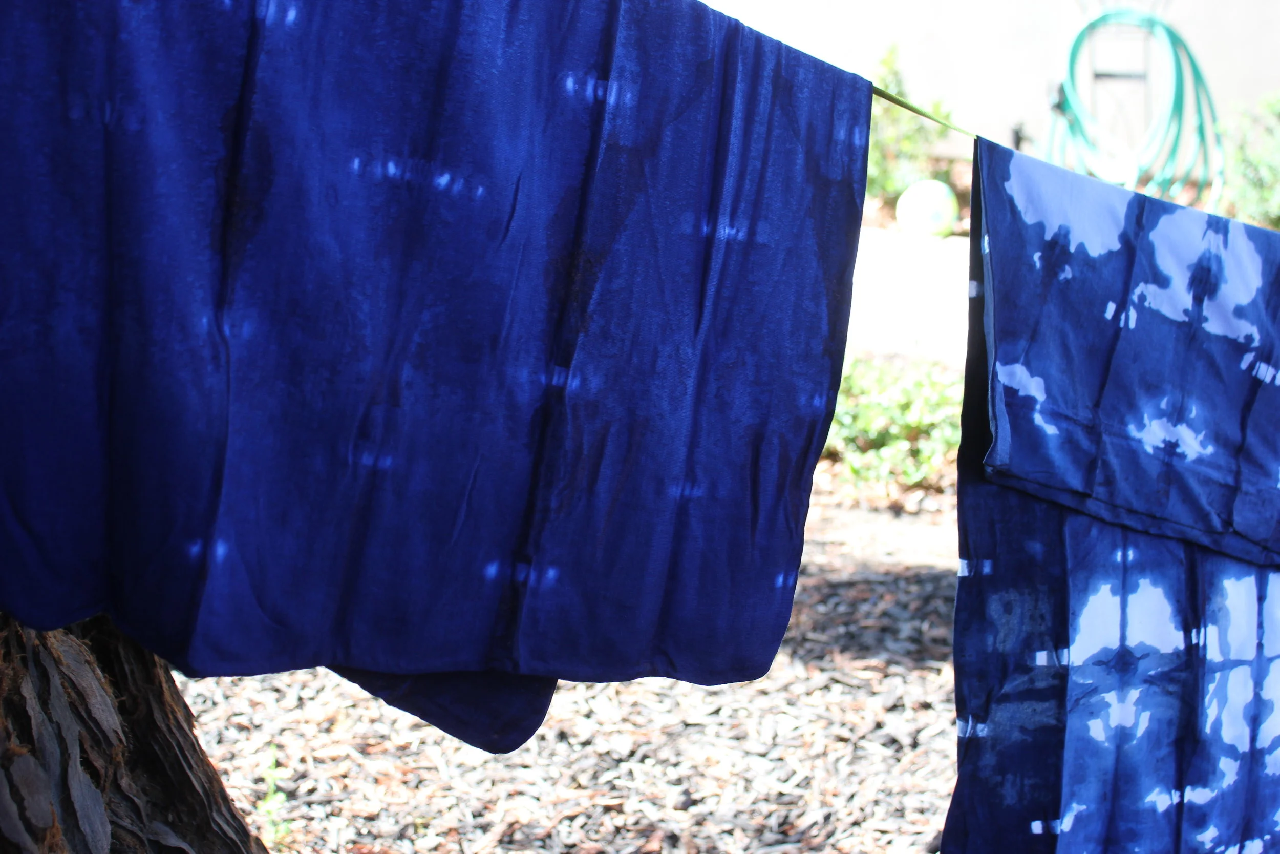 The results are a fantastic collection of surprise and beauty. My favorite part about this process is the oxidization. When you're initially dunking the cloth in the indigo solution, it's this bright, alluring green. Once you wring out the excess liquid and hang it to dry, the work begins to oxidize and the deep indigo color sets in.