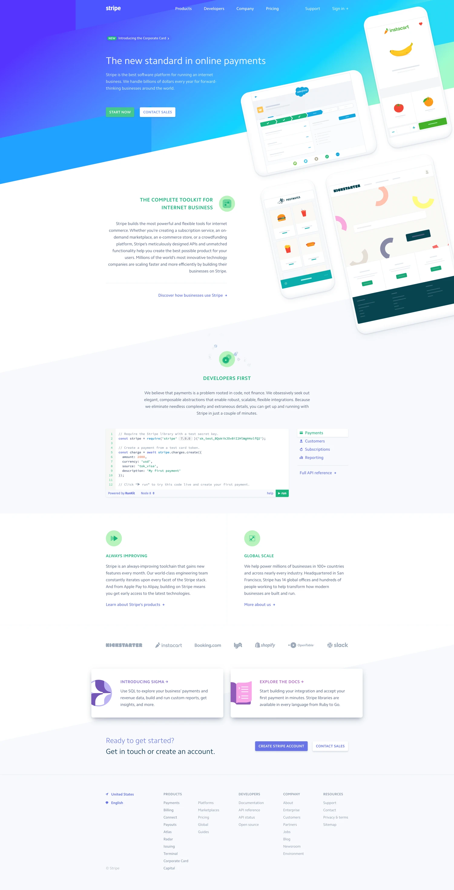 Have you seen the Stripe site? It's been passed around quite frequently in the design world. A designer might argue that it's the pinnacle website design for tech. It's clean, unique, meticulously designed for all responsive layouts, and overall sets a higher standard for similar tech companies. It seems to have caused a ripple effect. It's perhaps impossible to know who first curated the "Stripe" template, but since its emergence other companies have followed suite. Some almost looking identical.